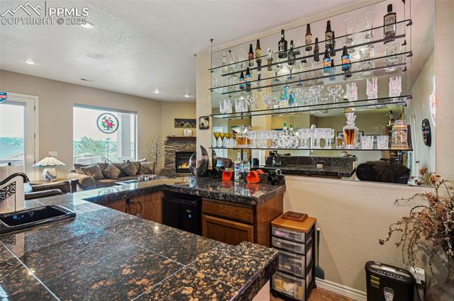 SPECTACULAR VIEWS! Experience elegance and views in this custom-built ranch-style home nestled in the prestigious Sanctuary at Peregrine community. From its striking stone and stucco exterior to the breathtaking city and mountain views, this residence offers a rare blend of comfort, sophistication, and privacy. Vaulted ceilings and arched architectural details create a grand and airy atmosphere. The spacious kitchen features granite countertops, a stylish backsplash, 36" cabinetry, and a large island perfect for entertaining. Radiant floor heating warms the kitchen, tile dining area, and upstairs bathrooms for year-round comfort. The main level features two generously sized bedrooms and two baths, including a luxurious primary suite with walk-out access, multiple closets, and a spa-like 5-piece bath with a jetted tub, oversized shower with bench, and double vanities. A formal dining room, a cozy living room with a fireplace, and a main-level laundry add convenience and elegance. Downstairs, the fully finished walk-out basement boasts a sprawling 43' x 24' family room with 9ft ceilings, a wet bar, two guest bedrooms, a large 3/4 bath with an oversized shower and seat, a half bath, and abundant storage space. Step outside to two expansive composite decks to enjoy views of the city and mountains. With no neighbors facing the front of the house and a peaceful greenbelt across the street, this home offers unmatched tranquility and scenic beauty. Additional highlights include wide 3-foot doorways, radiant heat, central air, two gas fireplaces, an oversized 3-car garage with 8-foot doors with a depth of 26 feet, a hot tub/spa, and a beautifully landscaped, low-maintenance yard. Located in Academy District 20 near parks and trails.